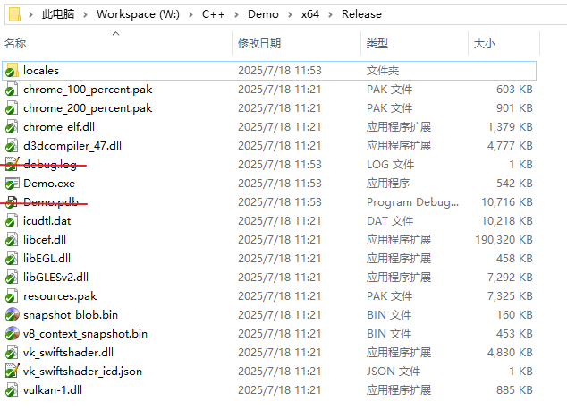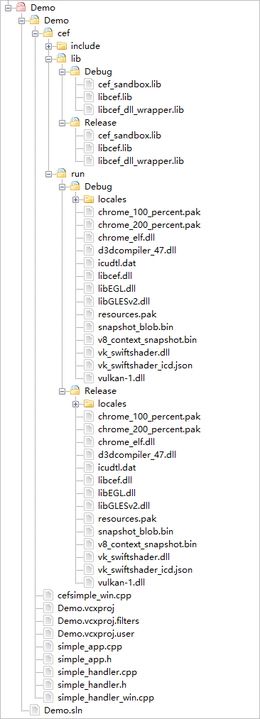将 “$CEF\Release” 下除了 “libcef.lib”、“cef_sandbox.lib” 的所有文件复制到 “Demo\Demo\cef\run\Release” 下;