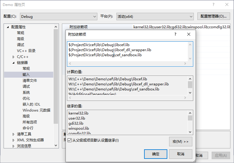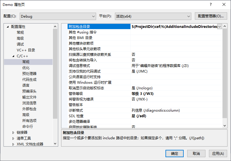 $(ProjectDir)cef,这里只能添加到cef这一层,不能是$(ProjectDir)cef\include,因为cef\include下的头文件都是通过#include "include/xx.h"方式来包含的。