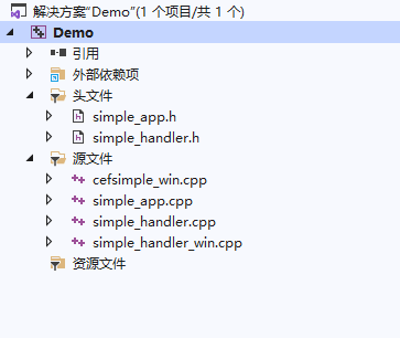将 “$CEF\tests\cefsimple” 下的 “cefsimple_win.cc”、“simple_app.cc”、“simple_app.h”、“simple_handler.cc”、“simple_handler.h”、“simple_handler_win.cc” 文件复制到 “Demo\Demo” 下,并且将.cc扩展名改为.cpp;