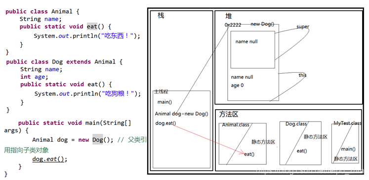 | public class MyTest { public static void main(String[] args) { Animal dog = new Dog(); // 父类引用指向子类对象 System.out.println(dog.name); } } |
