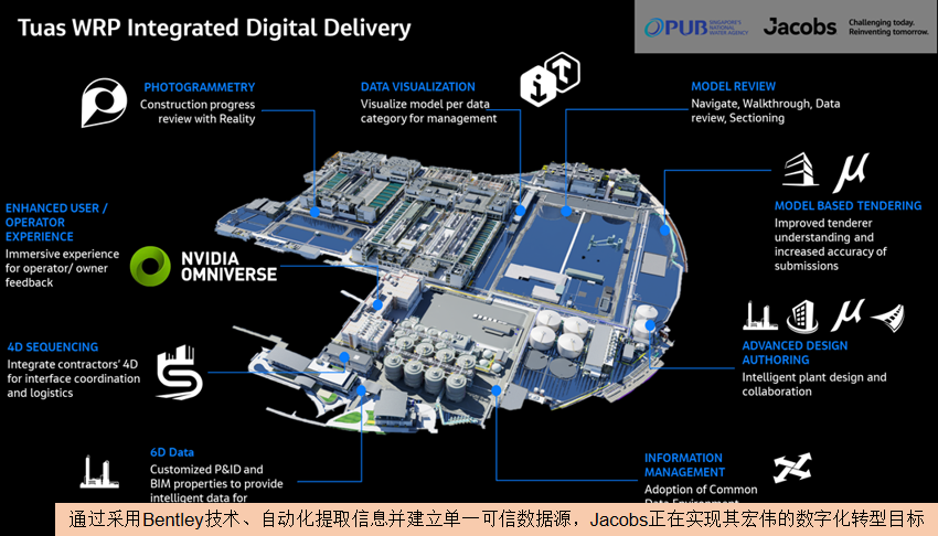 Jacobs利用Bentley ProjectWise及其开放式建模应用程序来创建初步和详细设计模型,并集成Bentley LumenRT,通过模型的形式呈现说明,并向投标方提供模型,而非传统的二维图纸。他们利用Bentley iTwin平台,拓展了数字化进程的边界,开发了集成的数字化交付流程,通过这一流程,他们与新加坡国家水务局能够共同审查各承包商提交的信息,并可视化多个标段的精确进度。Kwan表示:“此进程的关键在于信息共享,使大士再生水厂全体人员可便捷获取信息。”Bentley iTwin平台提供独特的云端协同能力,项目团队和利益相关方能够通过网页浏览器无缝协作,消除了技术复杂性,为非技术终端用户带来便捷体验。