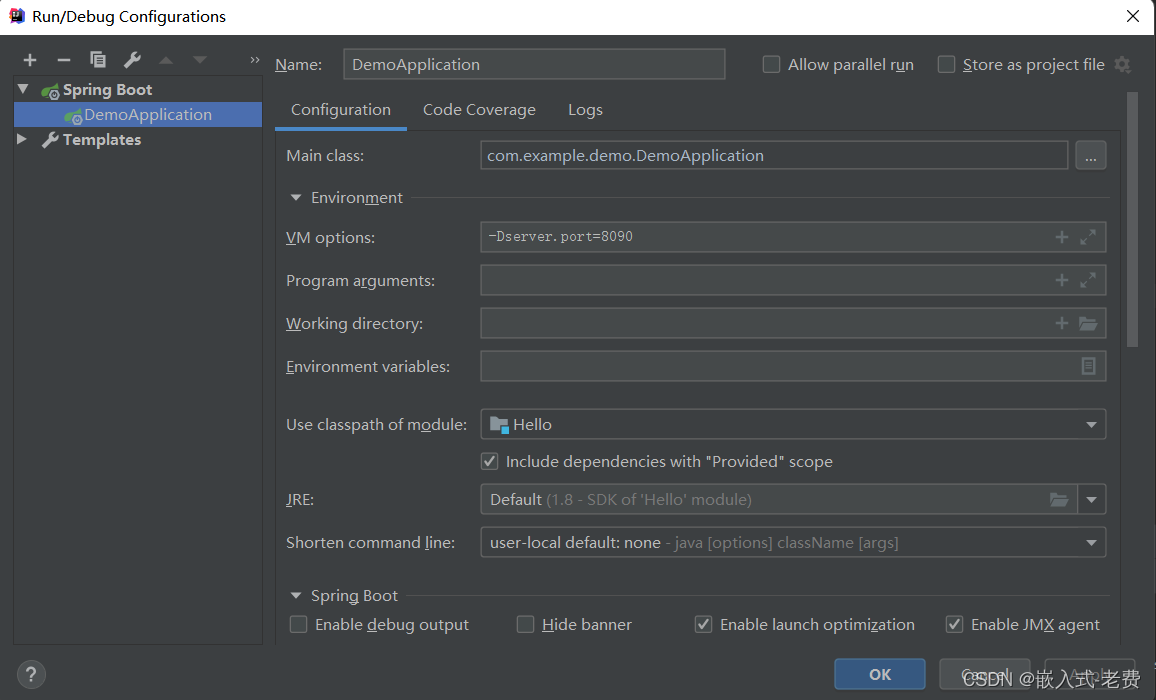 "C:\Program Files (x86)\Java\jdk1.8.0_91\bin\java.exe" -Dserver.port=8090 -XX:TieredStopAtLevel=1 -noverify -Dspring.output.ansi.enabled=always -Dcom.sun.management.jmxremote -Dspring.jmx.enabled=true -Dspring.liveBeansView.mbeanDomain -Dspring.application.admin.enabled=true "-javaagent:C:\Program Files\JetBrains\IntelliJ IDEA 2020.1.1\lib\idea_rt.jar=63113:C:\Program Files\JetBrains\IntelliJ IDEA 2020.1.1\bin" -Dfile.encoding=UTF-8 -classpath "C:\Program Files (x86)\Java\jdk1.8.0_91\jre\lib\charsets.jar;C:\Program Files (x86)\Java\jdk1.8.0_91\jre\lib\deploy.jar;C:\Program Files (x86)\Java\jdk1.8.0_91\jre\lib\ext\access-bridge-32.jar;C:\Program Files (x86)\Java\jdk1.8.0_91\jre\lib\ext\cldrdata.jar;C:\Program Files (x86)\Java\jdk1.8.0_91\jre\lib\ext\dnsns.jar;C:\Program Files (x86)\Java\jdk1.8.0_91\jre\lib\ext\jaccess.jar;C:\Program Files (x86)\Java\jdk1.8.0_91\jre\lib\ext\jfxrt.jar;C:\Program Files (x86)\Java\jdk1.8.0_91\jre\lib\ext\localedata.jar;C:\Program Files (x86)\Java\jdk1.8.0_91\jre\lib\ext\nashorn.jar;C:\Program Files (x86)\Java\jdk1.8.0_91\jre\lib\ext\sunec.jar;C:\Program Files (x86)\Java\jdk1.8.0_91\jre\lib\ext\sunjce_provider.jar;C:\Program Files (x86)\Java\jdk1.8.0_91\jre\lib\ext\sunmscapi.jar;C:\Program Files (x86)\Java\jdk1.8.0_91\jre\lib\ext\sunpkcs11.jar;C:\Program Files (x86)\Java\jdk1.8.0_91\jre\lib\ext\zipfs.jar;C:\Program Files (x86)\Java\jdk1.8.0_91\jre\lib\javaws.jar;C:\Program Files (x86)\Java\jdk1.8.0_91\jre\lib\jce.jar;C:\Program Files (x86)\Java\jdk1.8.0_91\jre\lib\jfr.jar;C:\Program Files (x86)\Java\jdk1.8.0_91\jre\lib\jfxswt.jar;C:\Program Files (x86)\Java\jdk1.8.0_91\jre\lib\jsse.jar;C:\Program Files (x86)\Java\jdk1.8.0_91\jre\lib\management-agent.jar;C:\Program Files (x86)\Java\jdk1.8.0_91\jre\lib\plugin.jar;C:\Program Files (x86)\Java\jdk1.8.0_91\jre\lib\resources.jar;C:\Program Files (x86)\Java\jdk1.8.0_91\jre\lib\rt.jar;C:\Users\feixiaoxing\Desktop\Hello\target\classes;D:\software\apache-maven-3.6.3-bin\repository\org\springframework\boot\spring-boot-starter-web\2.7.4\spring-boot-starter-web-2.7.4.jar;D:\software\apache-maven-3.6.3-bin\repository\org\springframework\boot\spring-boot-starter\2.7.4\spring-boot-starter-2.7.4.jar;D:\software\apache-maven-3.6.3-bin\repository\org\springframework\boot\spring-boot\2.7.4\spring-boot-2.7.4.jar;D:\software\apache-maven-3.6.3-bin\repository\org\springframework\boot\spring-boot-autoconfigure\2.7.4\spring-boot-autoconfigure-2.7.4.jar;D:\software\apache-maven-3.6.3-bin\repository\org\springframework\boot\spring-boot-starter-logging\2.7.4\spring-boot-starter-logging-2.7.4.jar;D:\software\apache-maven-3.6.3-bin\repository\ch\qos\logback\logback-classic\1.2.11\logback-classic-1.2.11.jar;D:\software\apache-maven-3.6.3-bin\repository\ch\qos\logback\logback-core\1.2.11\logback-core-1.2.11.jar;D:\software\apache-maven-3.6.3-bin\repository\org\apache\logging\log4j\log4j-to-slf4j\2.17.2\log4j-to-slf4j-2.17.2.jar;D:\software\apache-maven-3.6.3-bin\repository\org\apache\logging\log4j\log4j-api\2.17.2\log4j-api-2.17.2.jar;D:\software\apache-maven-3.6.3-bin\repository\org\slf4j\jul-to-slf4j\1.7.36\jul-to-slf4j-1.7.36.jar;D:\software\apache-maven-3.6.3-bin\repository\jakarta\annotation\jakarta.annotation-api\1.3.5\jakarta.annotation-api-1.3.5.jar;D:\software\apache-maven-3.6.3-bin\repository\org\yaml\snakeyaml\1.30\snakeyaml-1.30.jar;D:\software\apache-maven-3.6.3-bin\repository\org\springframework\boot\spring-boot-starter-json\2.7.4\spring-boot-starter-json-2.7.4.jar;D:\software\apache-maven-3.6.3-bin\repository\com\fasterxml\jackson\core\jackson-databind\2.13.4\jackson-databind-2.13.4.jar;D:\software\apache-maven-3.6.3-bin\repository\com\fasterxml\jackson\core\jackson-annotations\2.13.4\jackson-annotations-2.13.4.jar;D:\software\apache-maven-3.6.3-bin\repository\com\fasterxml\jackson\core\jackson-core\2.13.4\jackson-core-2.13.4.jar;D:\software\apache-maven-3.6.3-bin\repository\com\fasterxml\jackson\datatype\jackson-datatype-jdk8\2.13.4\jackson-datatype-jdk8-2.13.4.jar;D:\software\apache-maven-3.6.3-bin\repository\com\fasterxml\jackson\datatype\jackson-datatype-jsr310\2.13.4\jackson-datatype-jsr310-2.13.4.jar;D:\software\apache-maven-3.6.3-bin\repository\com\fasterxml\jackson\module\jackson-module-parameter-names\2.13.4\jackson-module-parameter-names-2.13.4.jar;D:\software\apache-maven-3.6.3-bin\repository\org\springframework\boot\spring-boot-starter-tomcat\2.7.4\spring-boot-starter-tomcat-2.7.4.jar;D:\software\apache-maven-3.6.3-bin\repository\org\apache\tomcat\embed\tomcat-embed-core\9.0.65\tomcat-embed-core-9.0.65.jar;D:\software\apache-maven-3.6.3-bin\repository\org\apache\tomcat\embed\tomcat-embed-el\9.0.65\tomcat-embed-el-9.0.65.jar;D:\software\apache-maven-3.6.3-bin\repository\org\apache\tomcat\embed\tomcat-embed-websocket\9.0.65\tomcat-embed-websocket-9.0.65.jar;D:\software\apache-maven-3.6.3-bin\repository\org\springframework\spring-web\5.3.23\spring-web-5.3.23.jar;D:\software\apache-maven-3.6.3-bin\repository\org\springframework\spring-beans\5.3.23\spring-beans-5.3.23.jar;D:\software\apache-maven-3.6.3-bin\repository\org\springframework\spring-webmvc\5.3.23\spring-webmvc-5.3.23.jar;D:\software\apache-maven-3.6.3-bin\repository\org\springframework\spring-aop\5.3.23\spring-aop-5.3.23.jar;D:\software\apache-maven-3.6.3-bin\repository\org\springframework\spring-context\5.3.23\spring-context-5.3.23.jar;D:\software\apache-maven-3.6.3-bin\repository\org\springframework\spring-expression\5.3.23\spring-expression-5.3.23.jar;D:\software\apache-maven-3.6.3-bin\repository\org\slf4j\slf4j-api\1.7.36\slf4j-api-1.7.36.jar;D:\software\apache-maven-3.6.3-bin\repository\org\springframework\spring-core\5.3.23\spring-core-5.3.23.jar;D:\software\apache-maven-3.6.3-bin\repository\org\springframework\spring-jcl\5.3.23\spring-jcl-5.3.23.jar" com.example.demo.DemoApplication