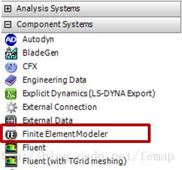 首先,打开ANSYS的workbench界面,选择Component Systems 列表下的FiniteElementModeler 模块,在右侧生成的模块中,双击Model选项。在导入网格文件的下拉框中,可以选择不同的数据格式,比如ABAQUS的 *inp 文件, ICEM的 *uns 文件。
