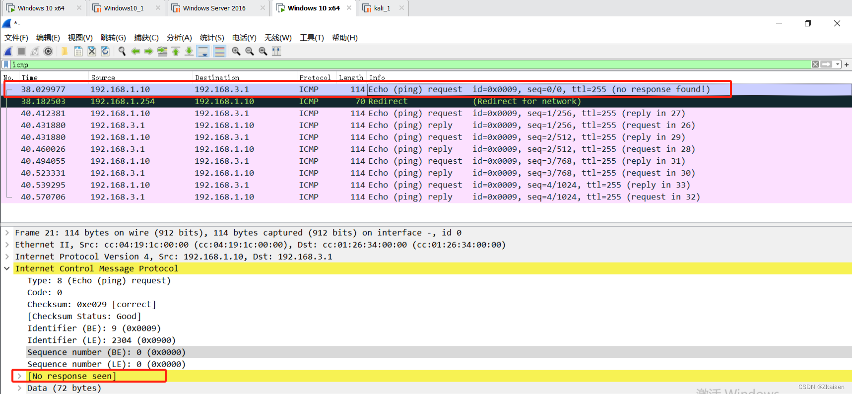 正常实施ICMP重定向攻击的话,Windows这台主机是不能通信的,实验结果的话在虚拟机里面很难实现。