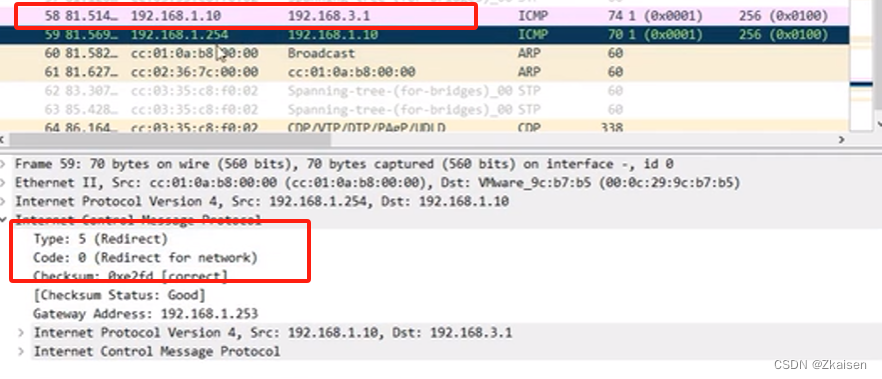 我们来看下ICMP报文的type和code字段,type类型为5,code为0表示对网络进行重定向