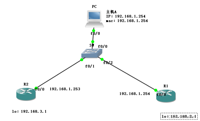 一台交换机和两台路由器,主机A通过交换机连接到路由器R1和R2,主机A的网关是R1,