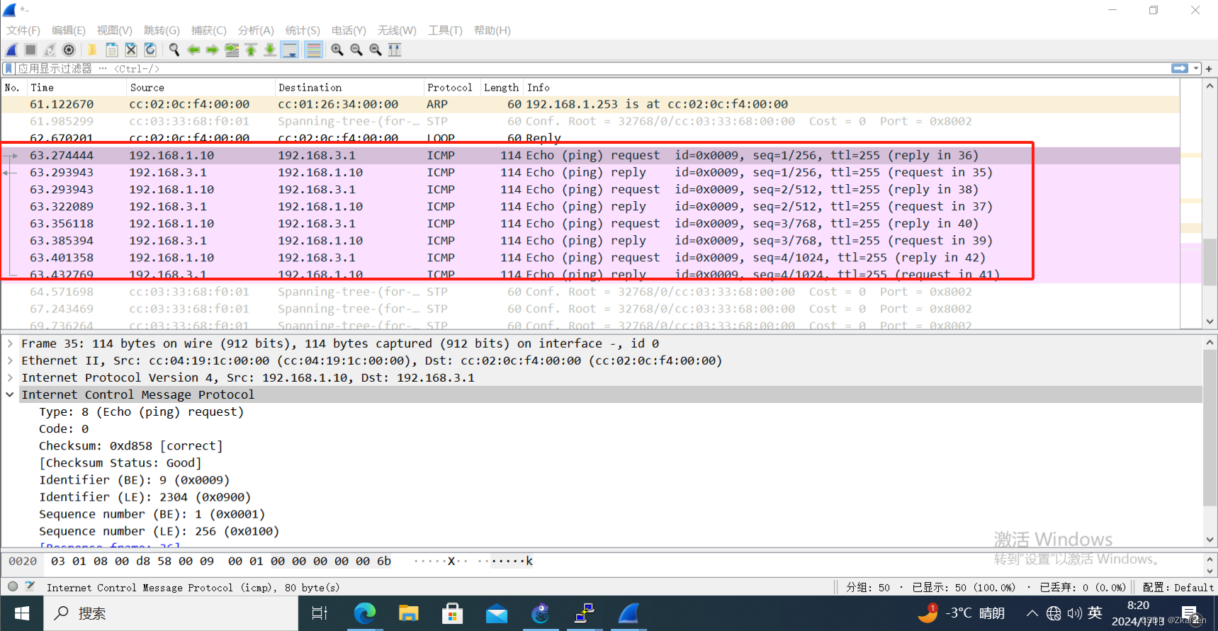 开启三条链路的抓包,然后主机ping192.168.3.1抓取数据进行分析。