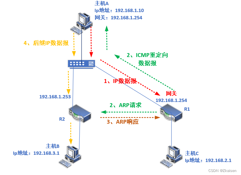 这样走的话就比较复杂了,因为从网络拓扑来看,主机A如果能够走R2到主机B的话显然是最优路线,那么就要引入了ICMP重定向l了。