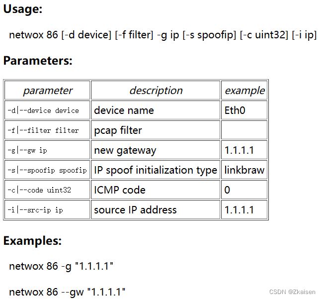 - 参数:-d 指定网卡 -f 过滤器 -g 新的网关 -s 欺骗IP -c ICMP代码 -i 源IP地址