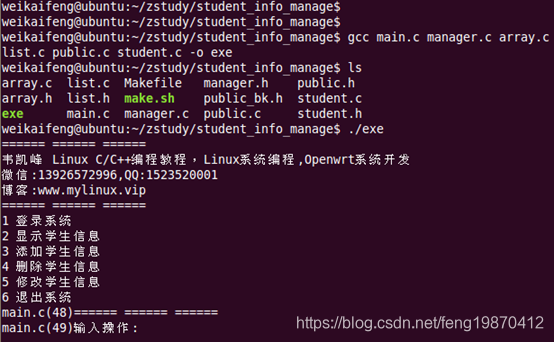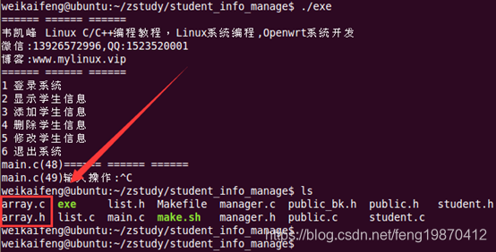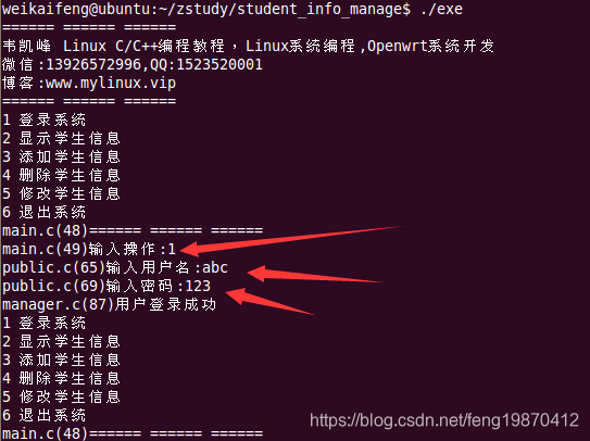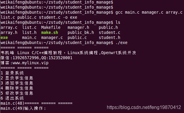 编译得到exe可执行程序,然后,执行 ./exe 程序。可以看到,这是一个学生信息管理系统,支持管理员的登陆,支持学生信息的查找、增加、删除、修改功能。