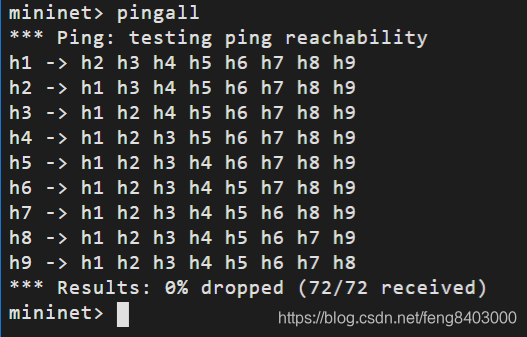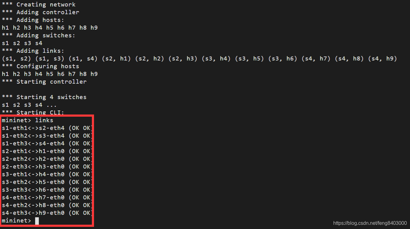 上图中的links用于查看链路连通性,dump查看节点信息,pingall测试各个主机之间是否连通。
