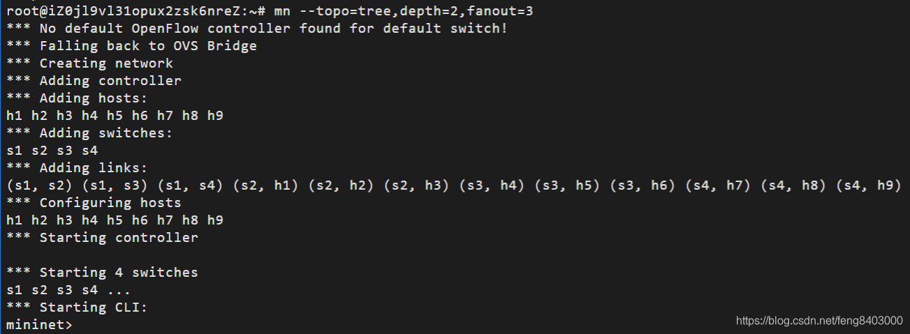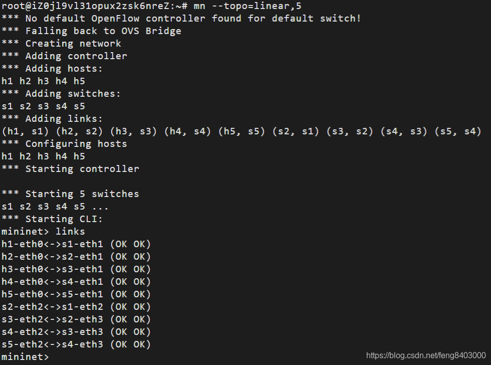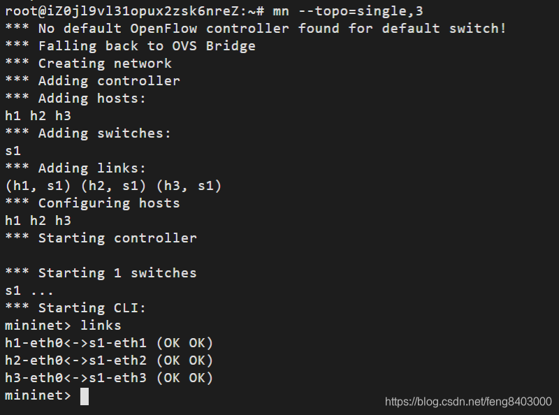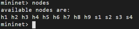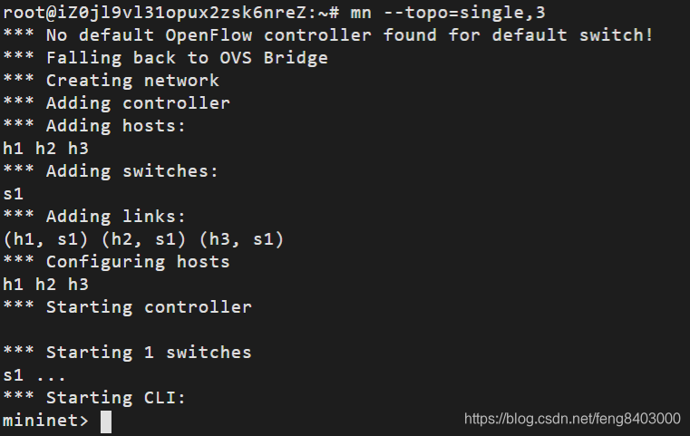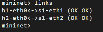 观察,可以知道,已经进入了这个自带的网络,网络中有1个交换机和2个主机,且在打开这个网络之后,进入了 mininet> 这个命令模式
