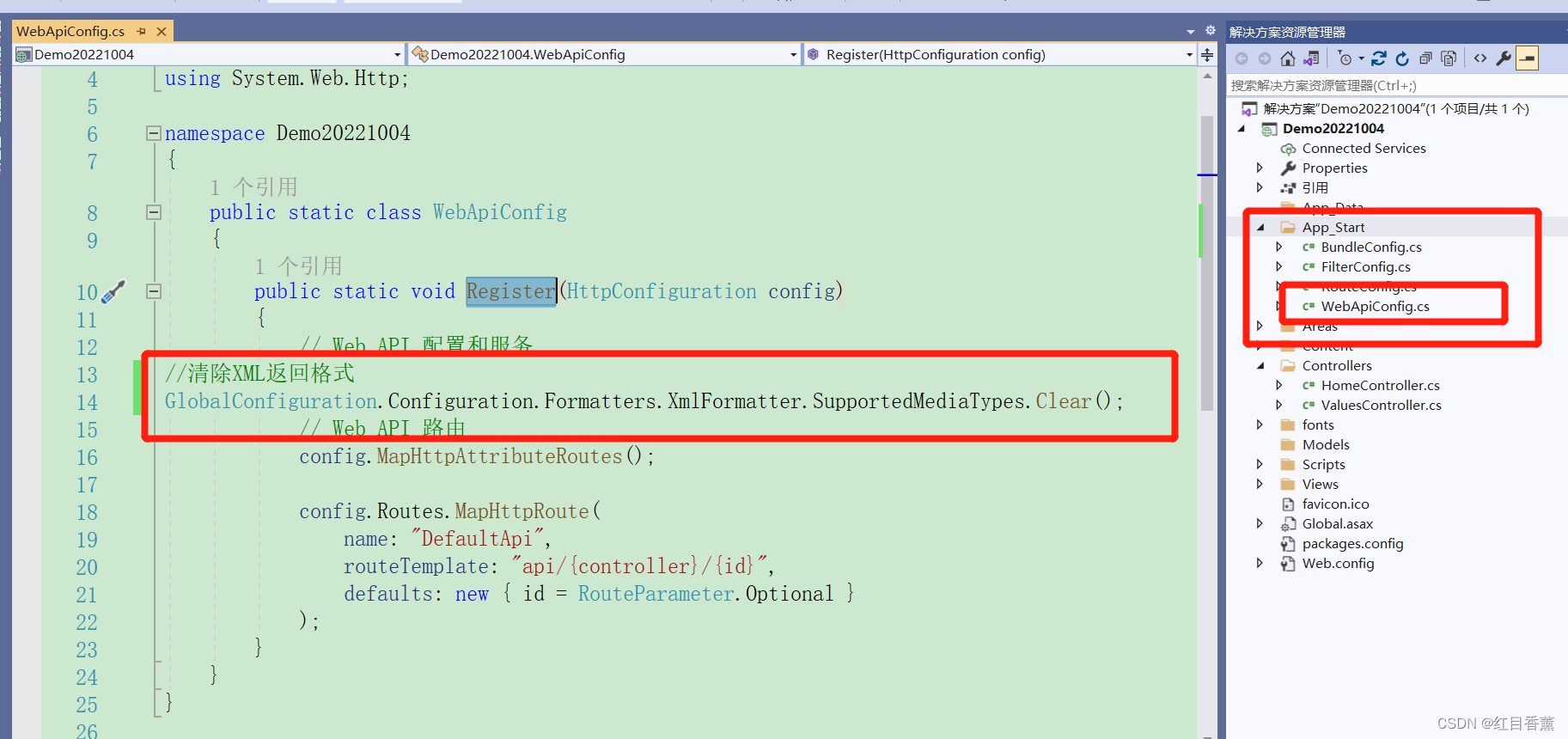 将下面的依据编码放置到App_start文件夹下的WebApiConfig里Register函数中。