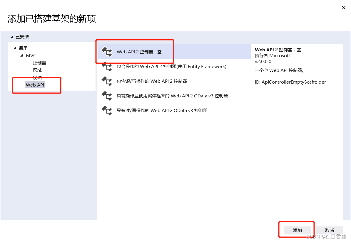 依次选择【Web API】,【Web API 2控制器 - 空】,【添加】