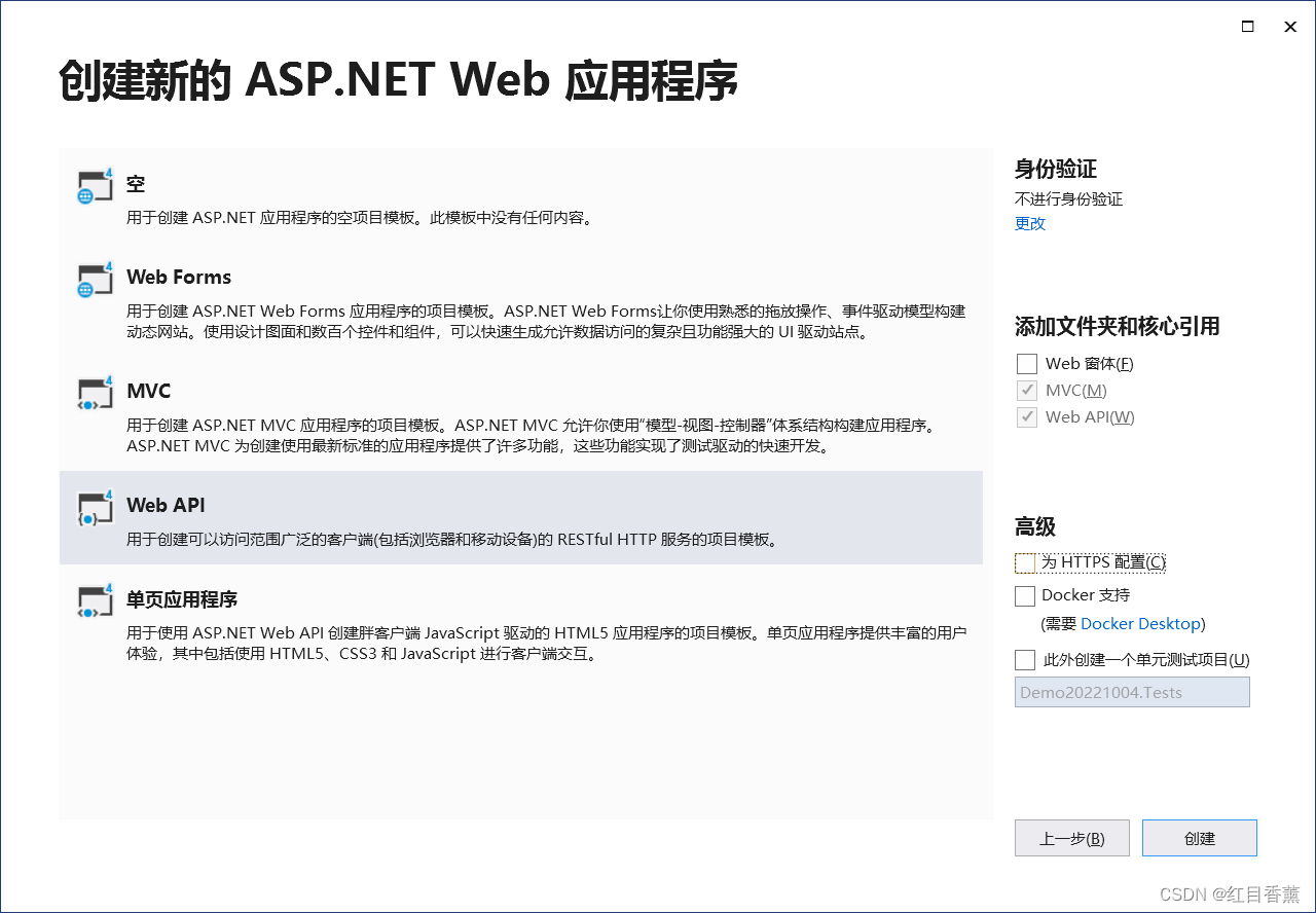 在创建项目的时候需要选择Web Api,取消【为HTTPS】配置,如果选了的话操作的时候会比较麻烦。