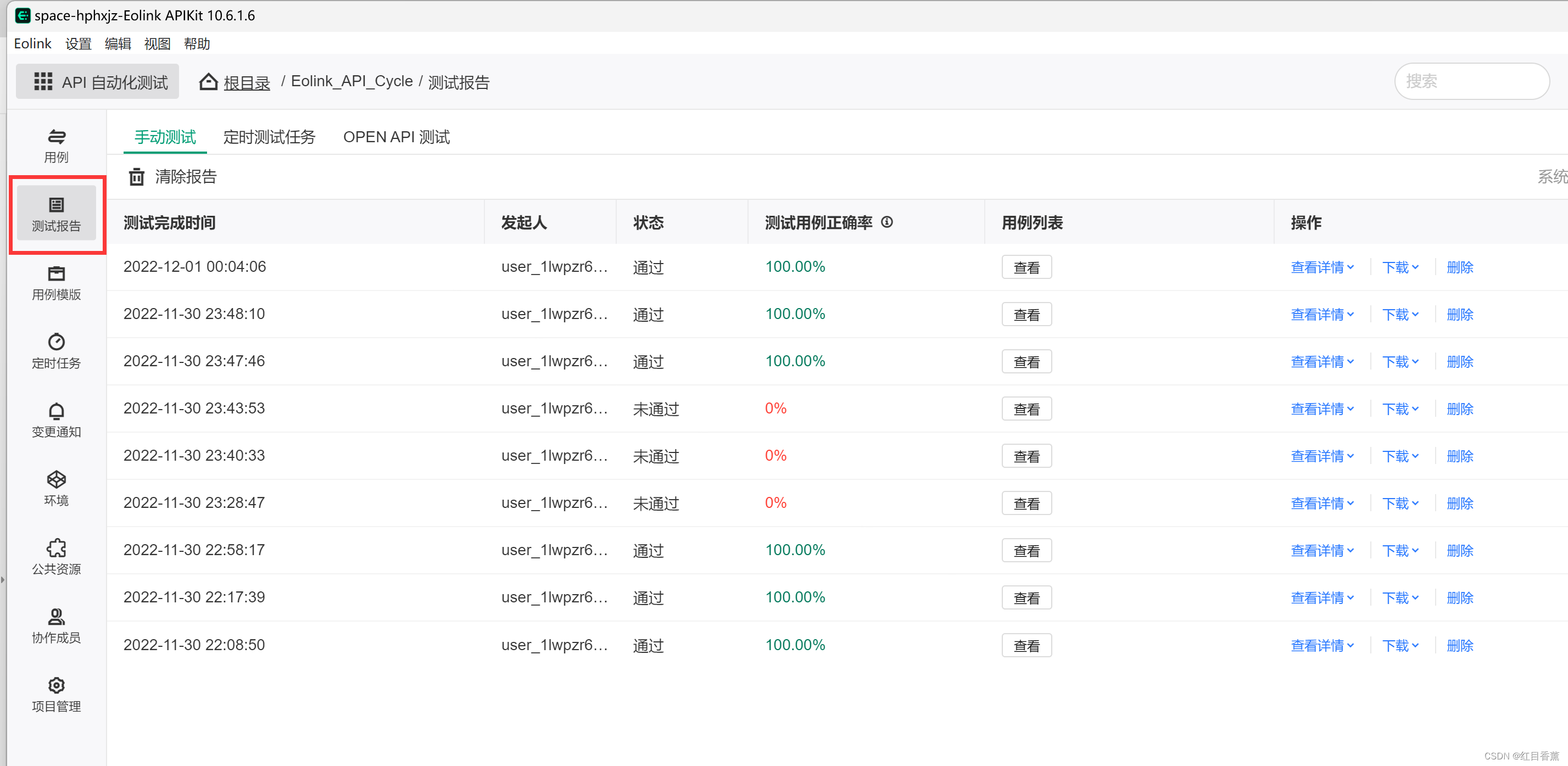 我们在【测试报告】就能看到我们刚刚所有的测试过程产生的测试报告,非常的方便,还提供详情信息与下载的功能。
