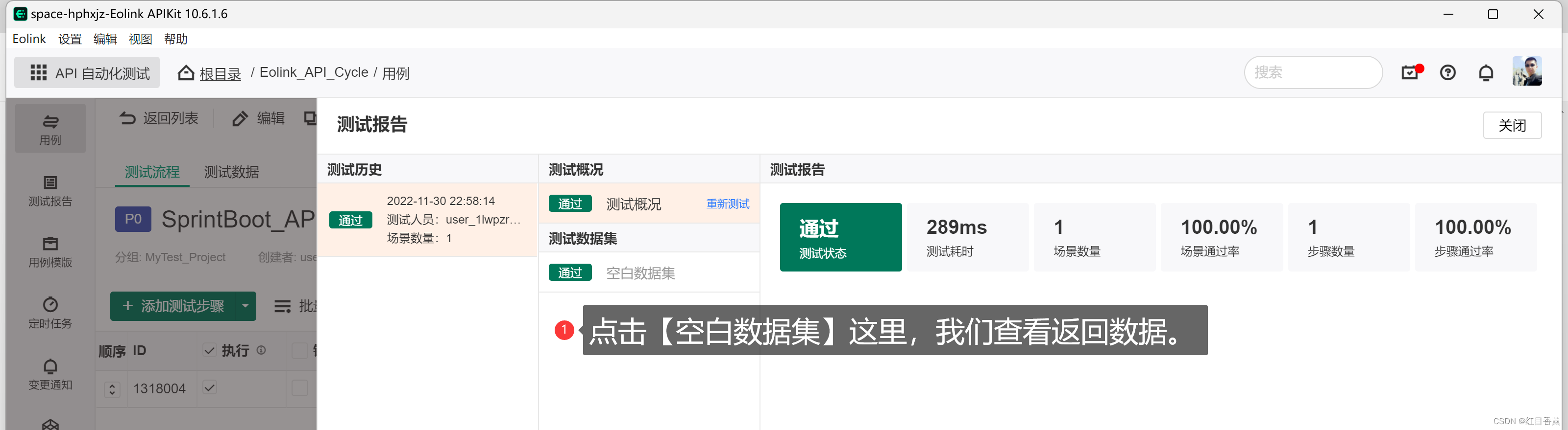 测试成功,但是未能直接看到测试的所有过程,我们点击【空白数据集】来查看所有的返回数据。