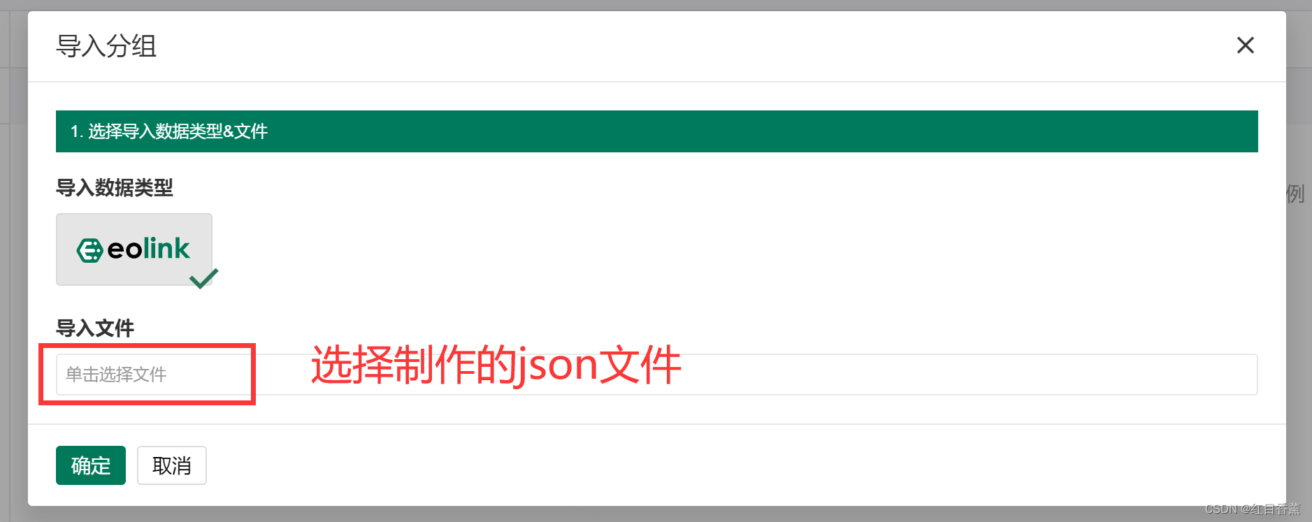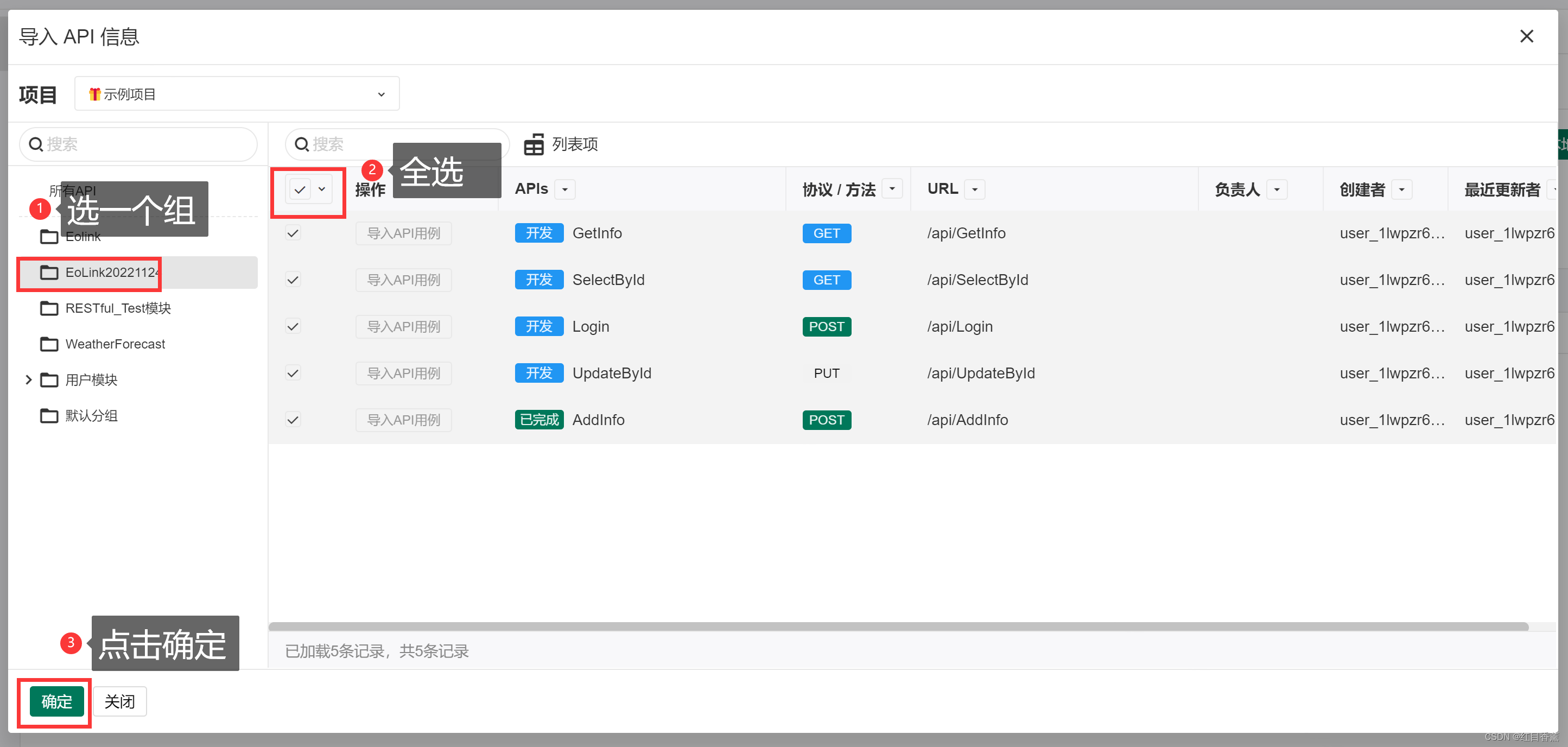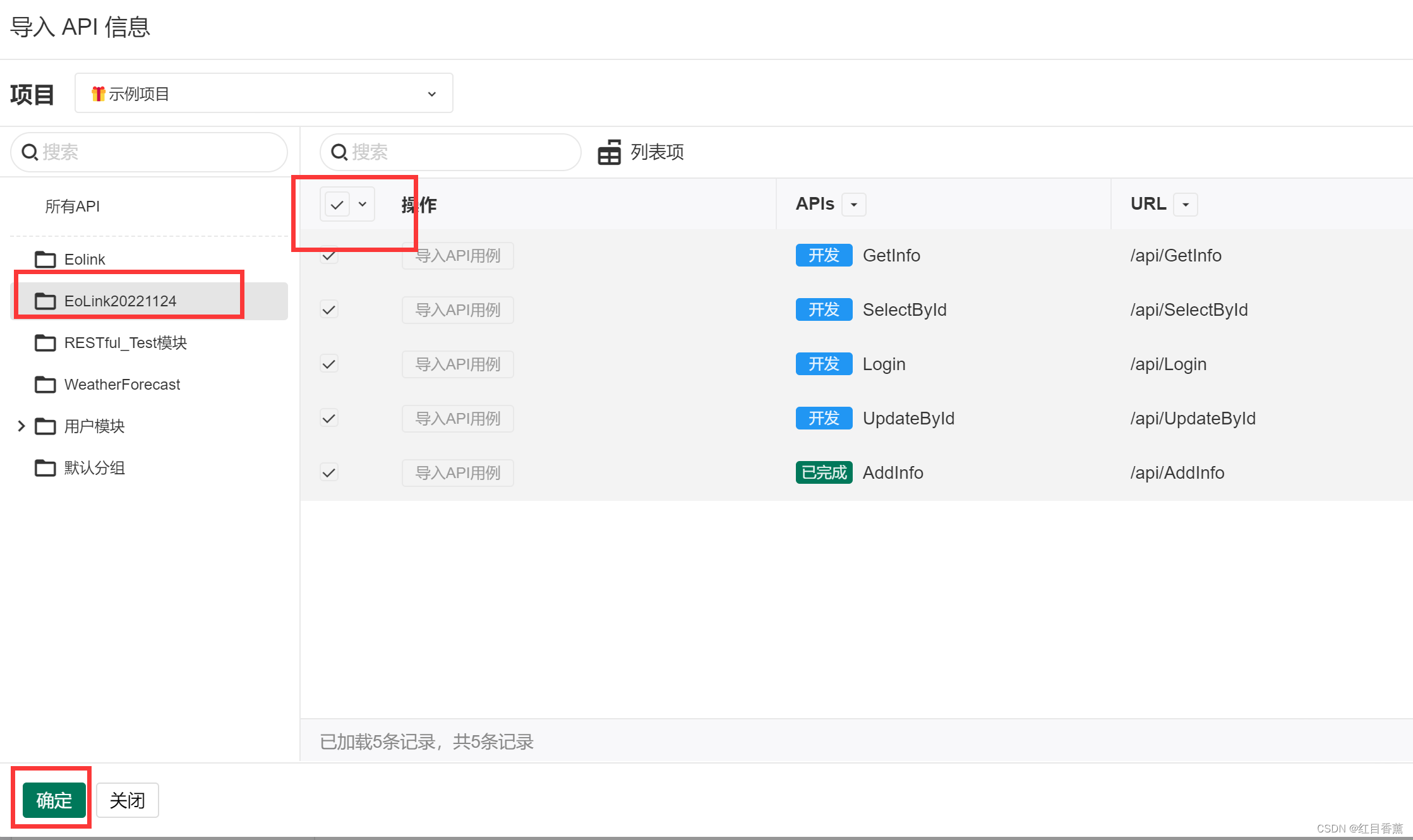 选一个引入的组,将API接口全部选项,并点击确定。