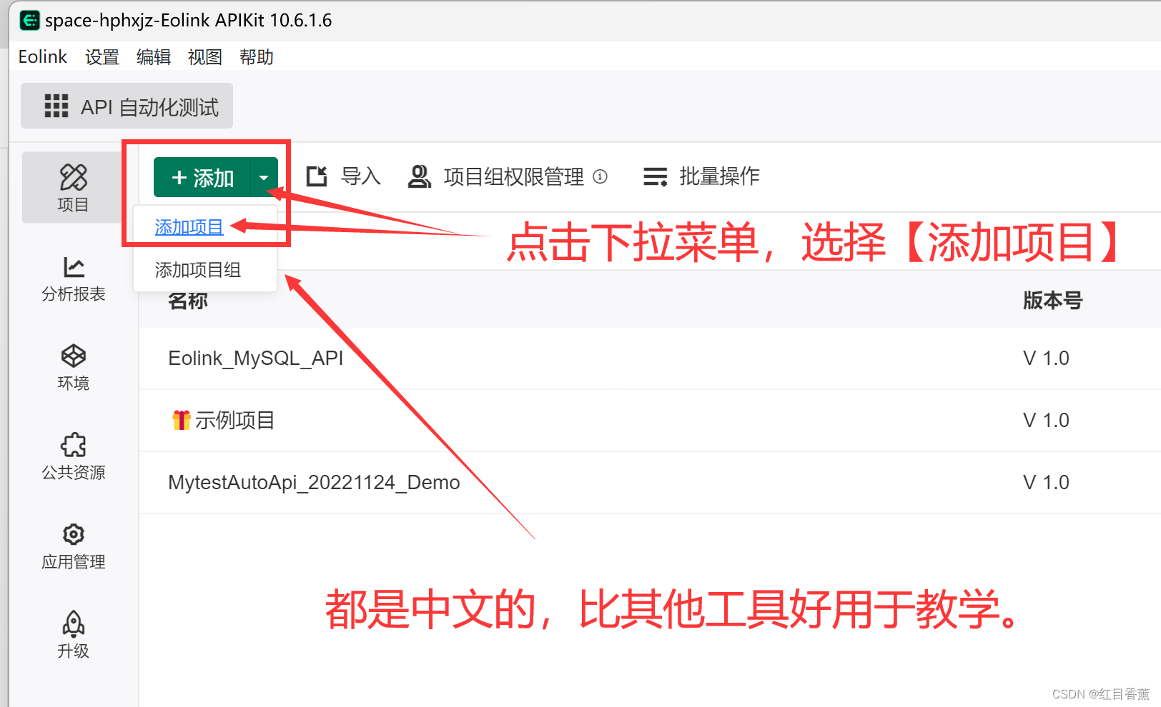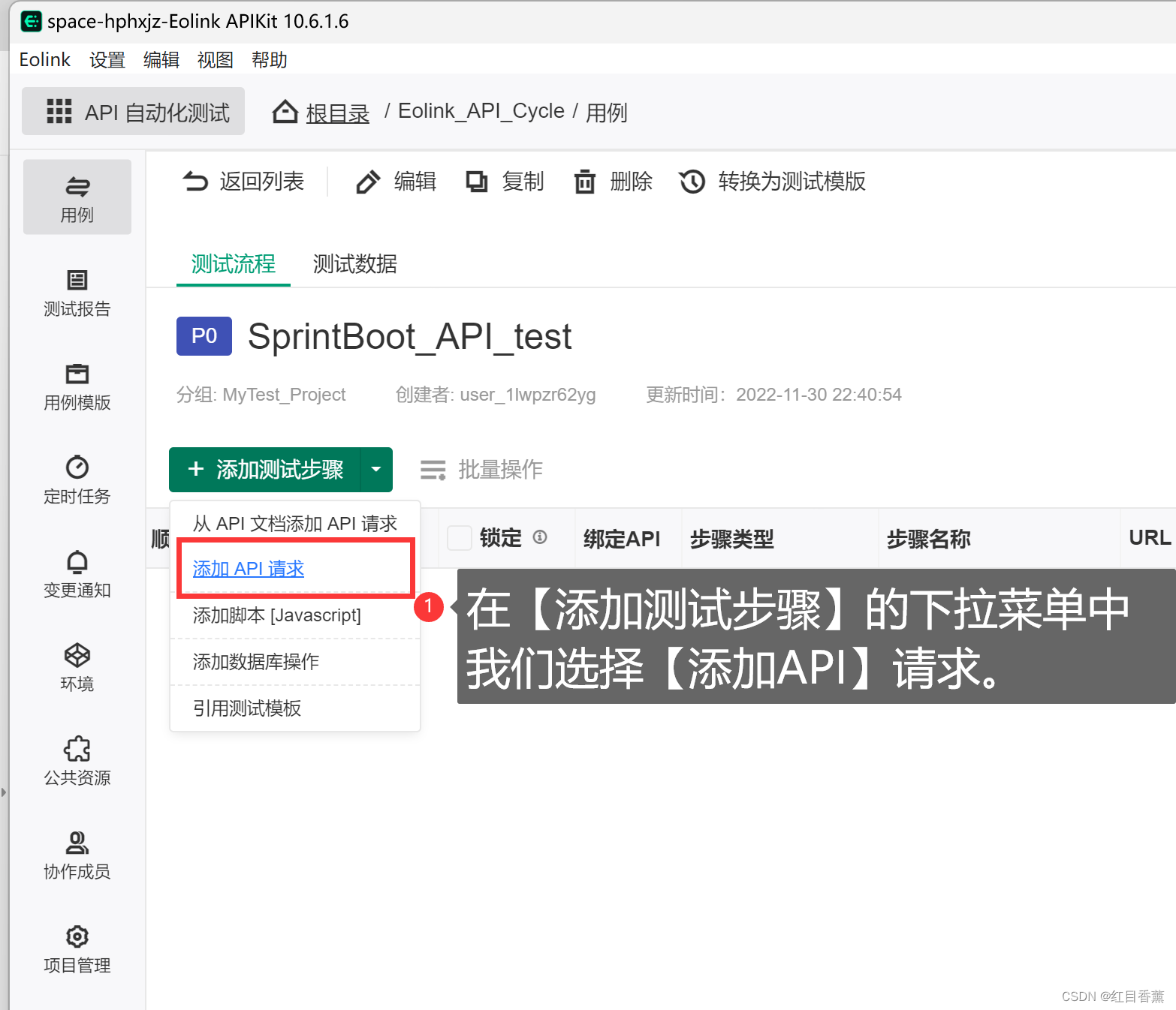 由于我们后面需要进行自动化接口测试,故而我们这里直接选择【API自动化测试】,在这里面创建项目。