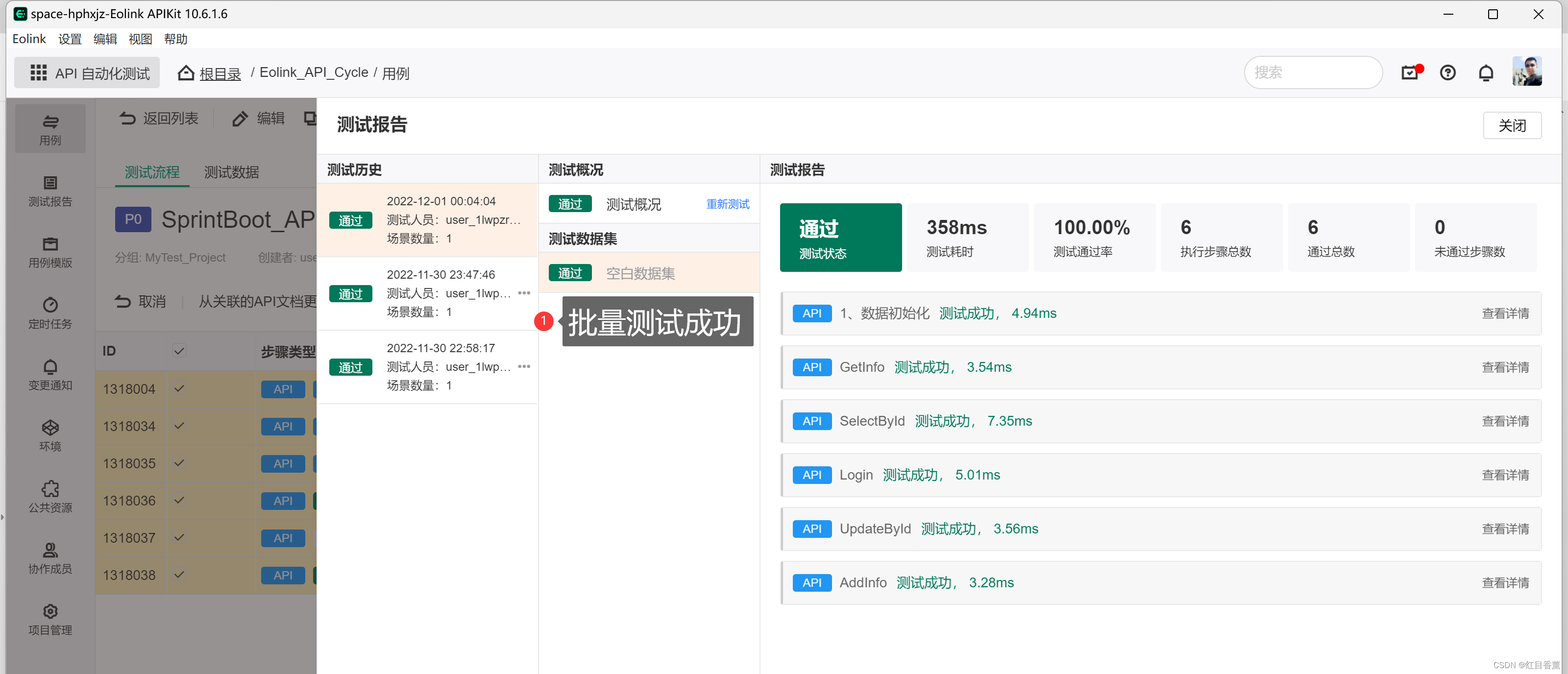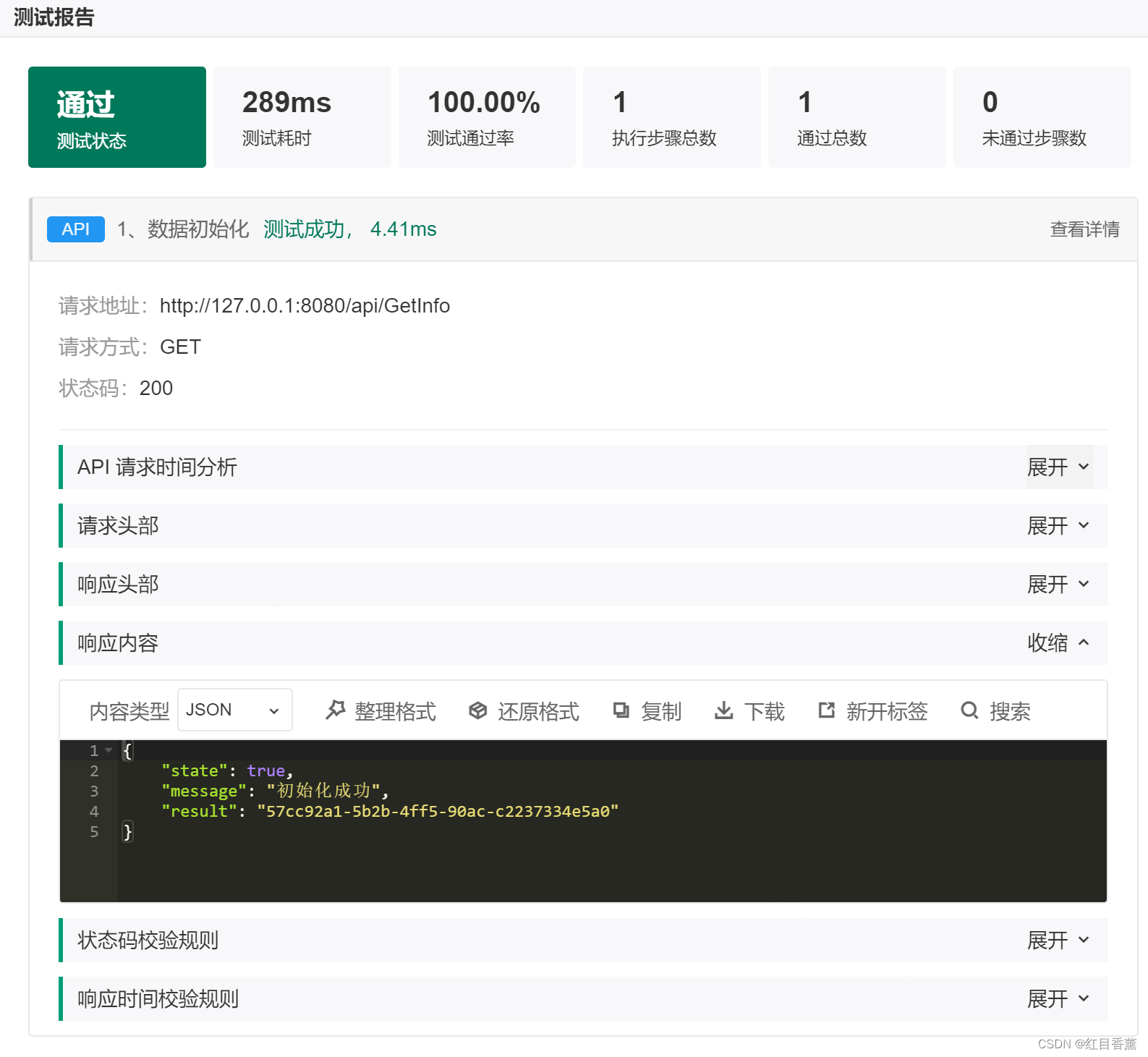 可以看到自动测试成功,并且返回测试结果。