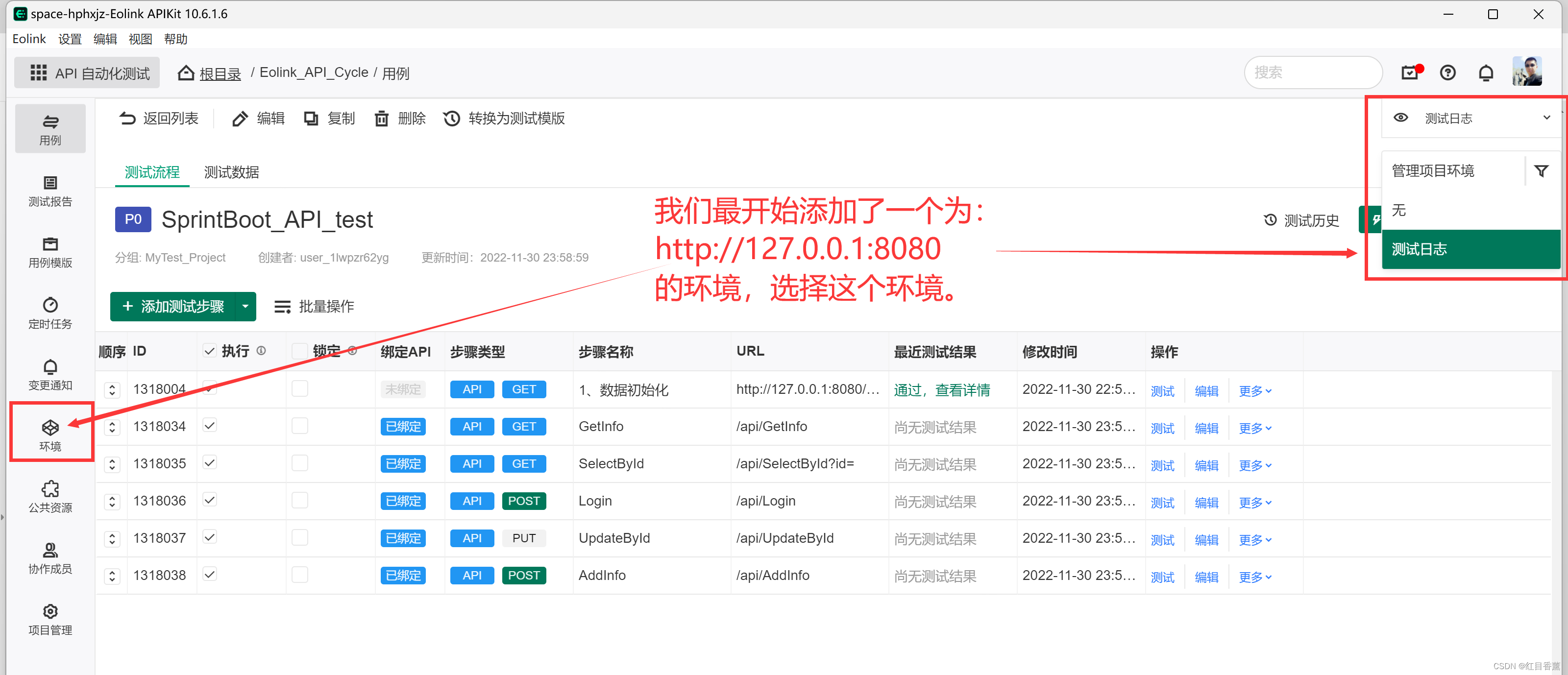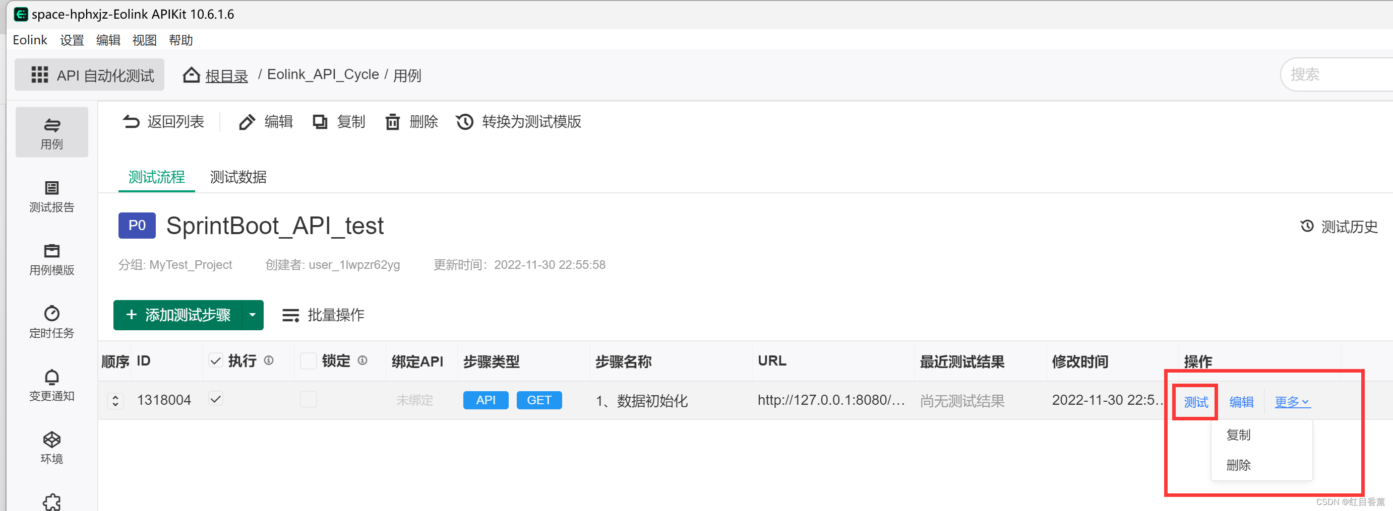 API的【测试】【修改】【删除】操作都在对应的用例接口列表中,我们可以直接操作,现在的步骤我们点击【测试】。