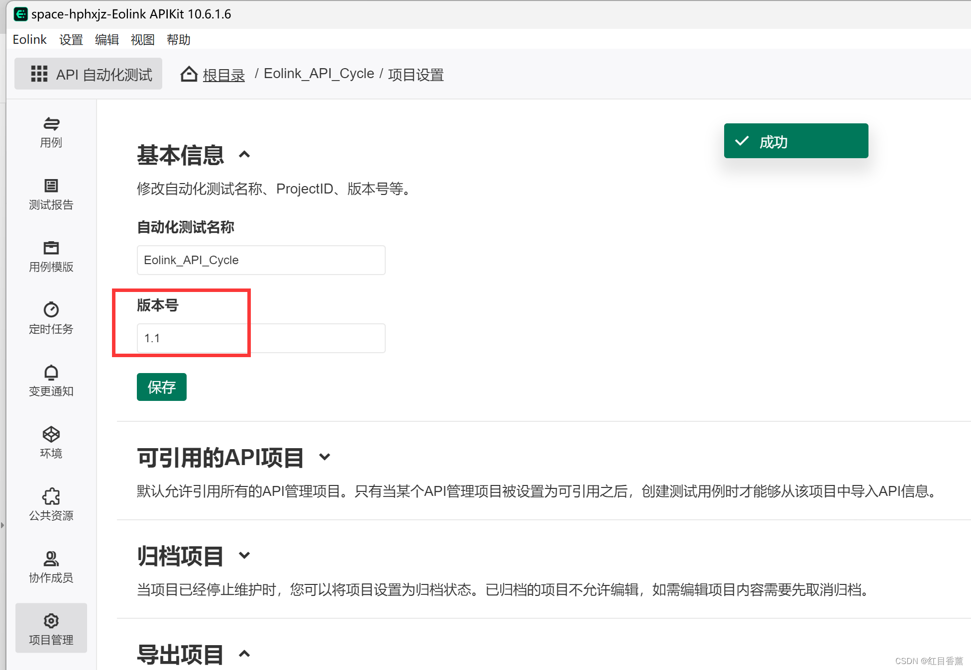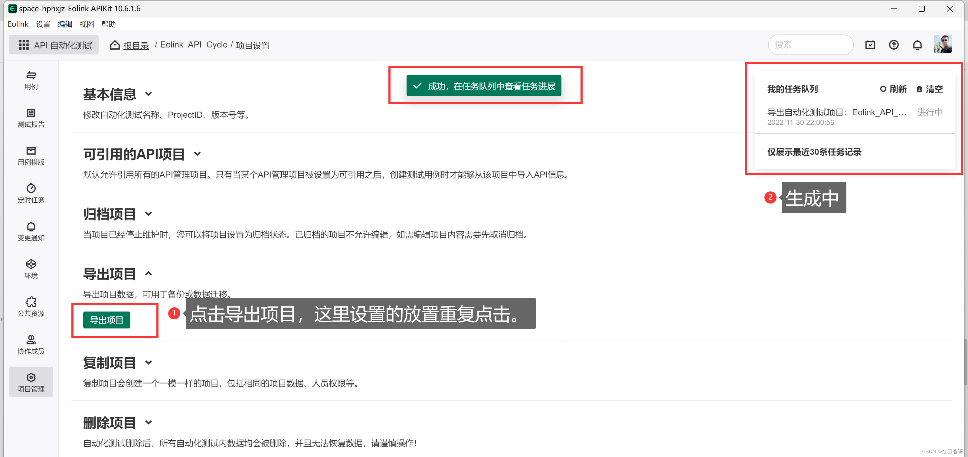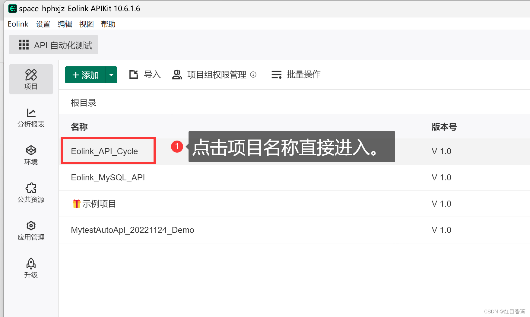 默认会返回面板,我们在右侧正文面板中能看到我们刚创建的【Eolink_API_Cycle】的Project。