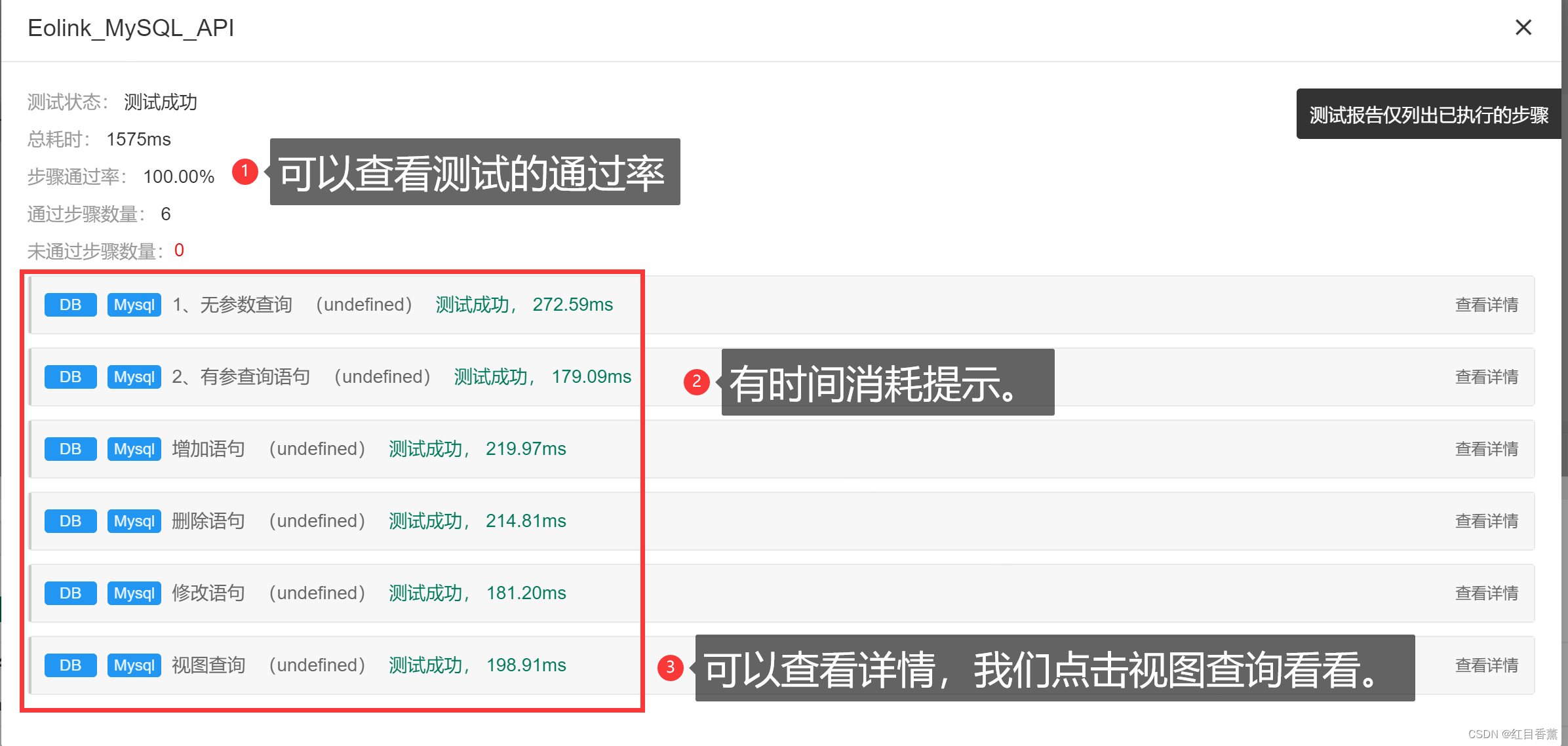 批量测试显示结果的空间是有限的,我们无法查看所有的接口具体测试结果,所以有了查看详情的操作。我们点击查看详情。