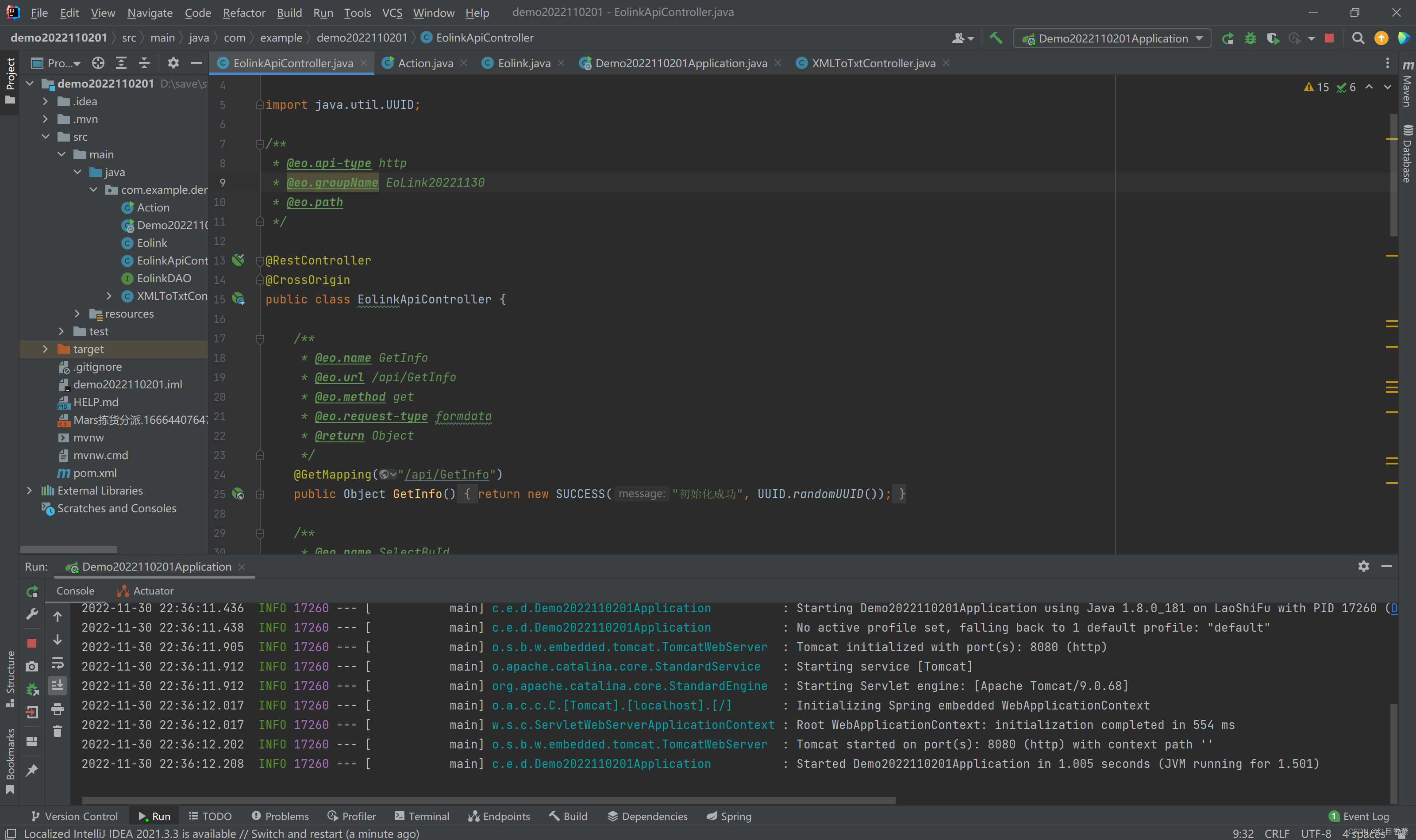 我自己启动了个本地的接口服务,从注释上就能看出来,这是Eolink的全自动注释,后面我会有对应的文章进行具体的配置讲解。
