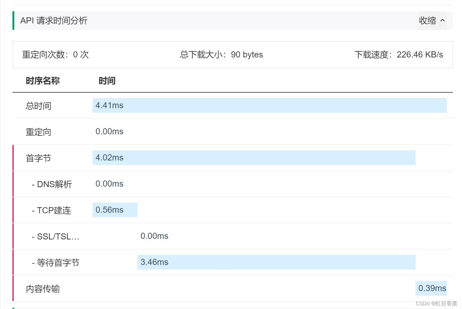 其实,作为一个资深的程序员,我对接口的总反应时间是非常看中的,我们打开【API请求时间分析】,在其中我们能看到各步骤的时间消耗,对于接口的优化非常有帮助。