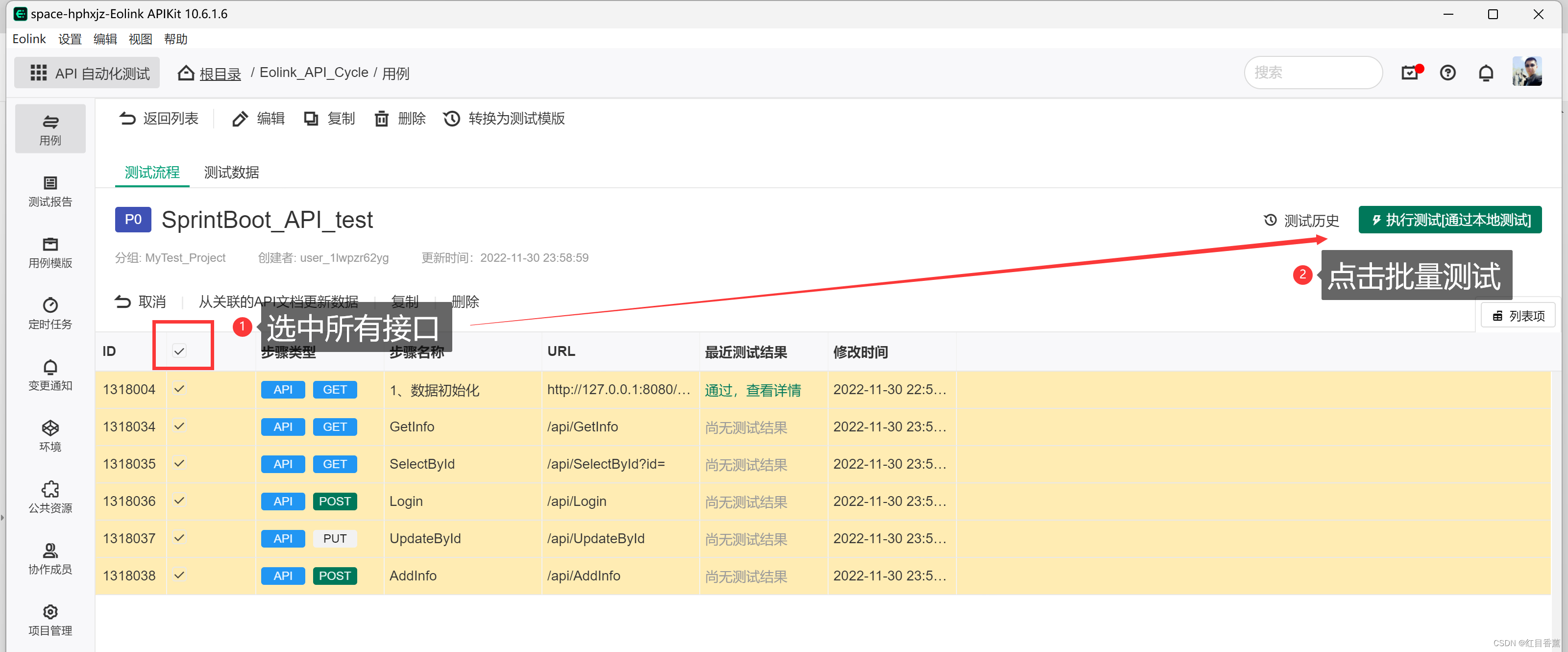 勾选所有要测试的接口,点击【执行测试】