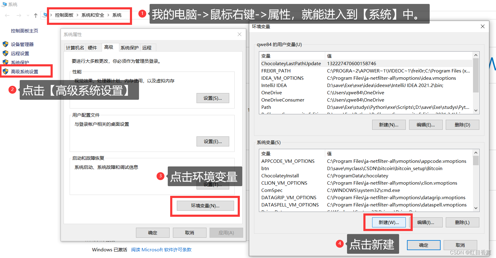 依次点击【高级系统设置】->【环境变量】->【新建(W)】。