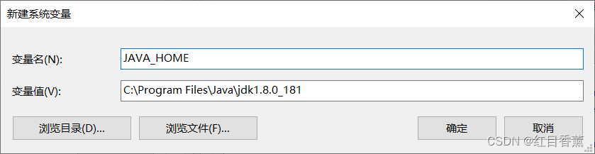 配置【JAVA_HOME】的变量名与【C:\Program Files\Java\jdk1.8.0_181】的变量值。点击确定。