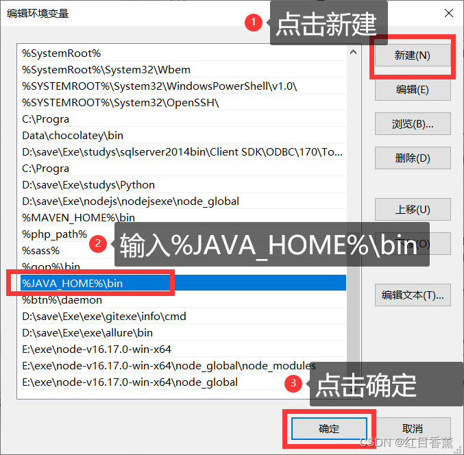 在【编辑环境变量】中,我们点击【新建】添加【%JAVA_HOME%\bin】,最后点击【确定】。