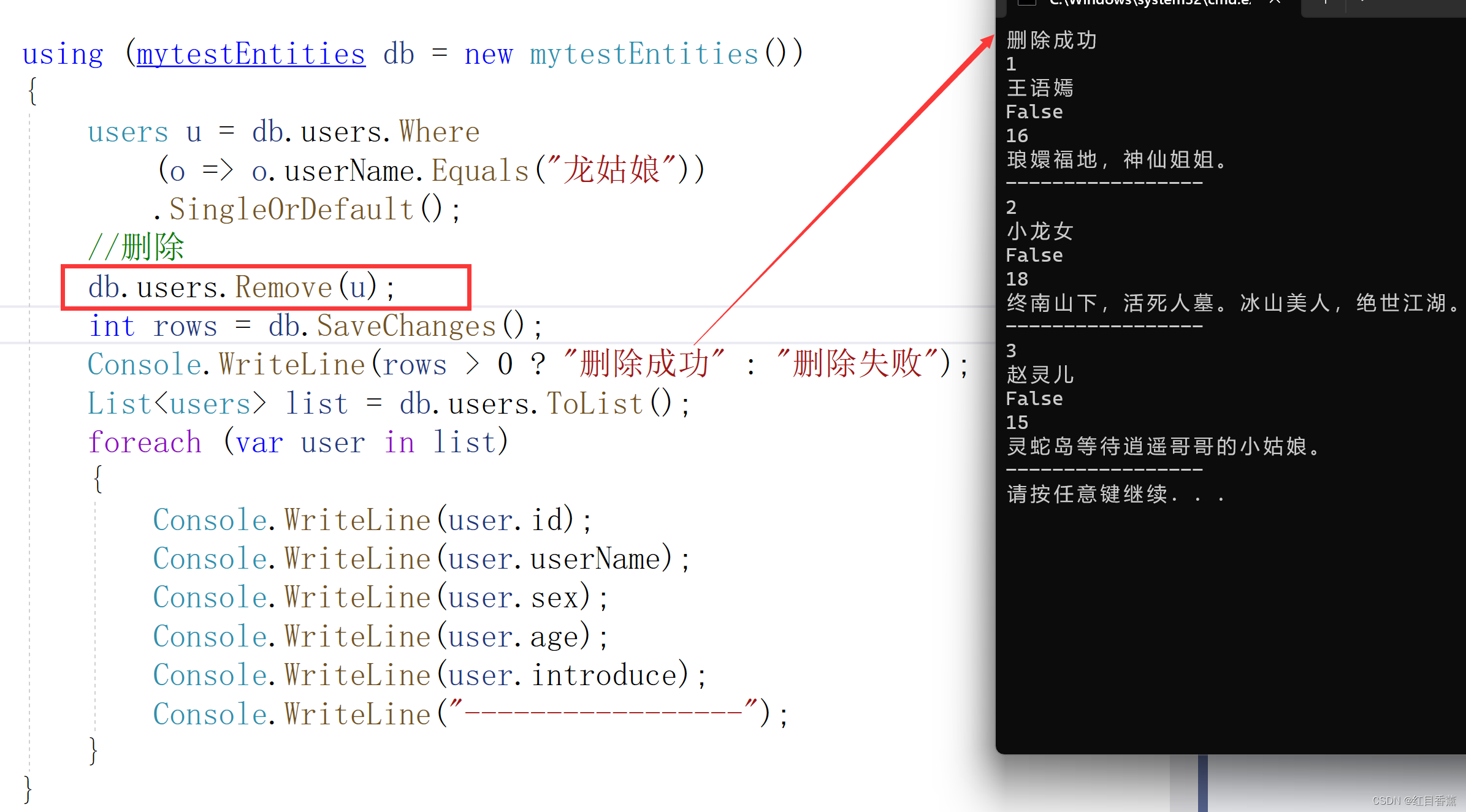 Console.WriteLine(rows > 0 ? "删除成功" : "删除失败");