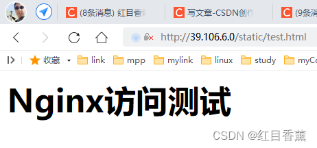 再次访问,并在ip后面添加对应路径,这里我们写的是【/static/test.html】,可以看到访问成功。