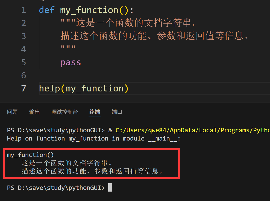 这将显示my_function函数的文档字符串内容。
