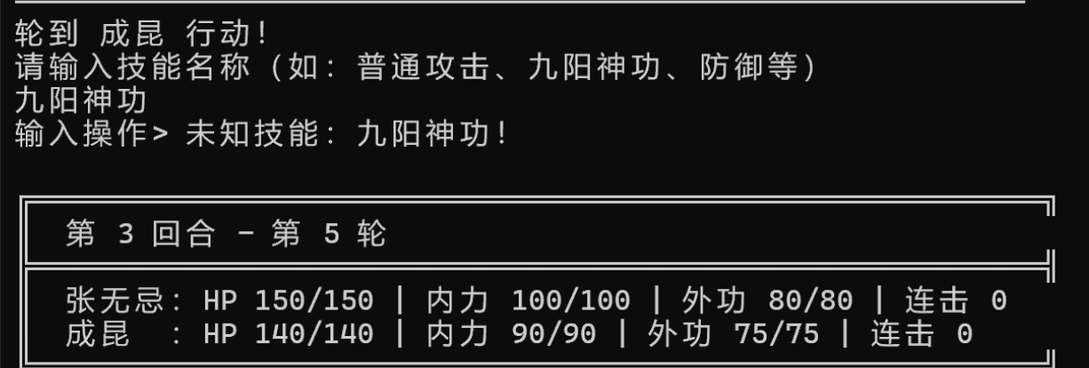 普通攻击- 基础攻击九阳神功- 内功攻击(消耗15内力,冷却2回合)乾坤大挪移- 外功攻击,可造成流血(消耗10外功,冷却1回合)太极拳连击- 连击技能(消耗12内力,冷却3回合)圣火令- 绝招(消耗25内力,冷却5回合)防御- 进入防御状态九阳回血- 恢复生命值(消耗20内力,冷却3回合)