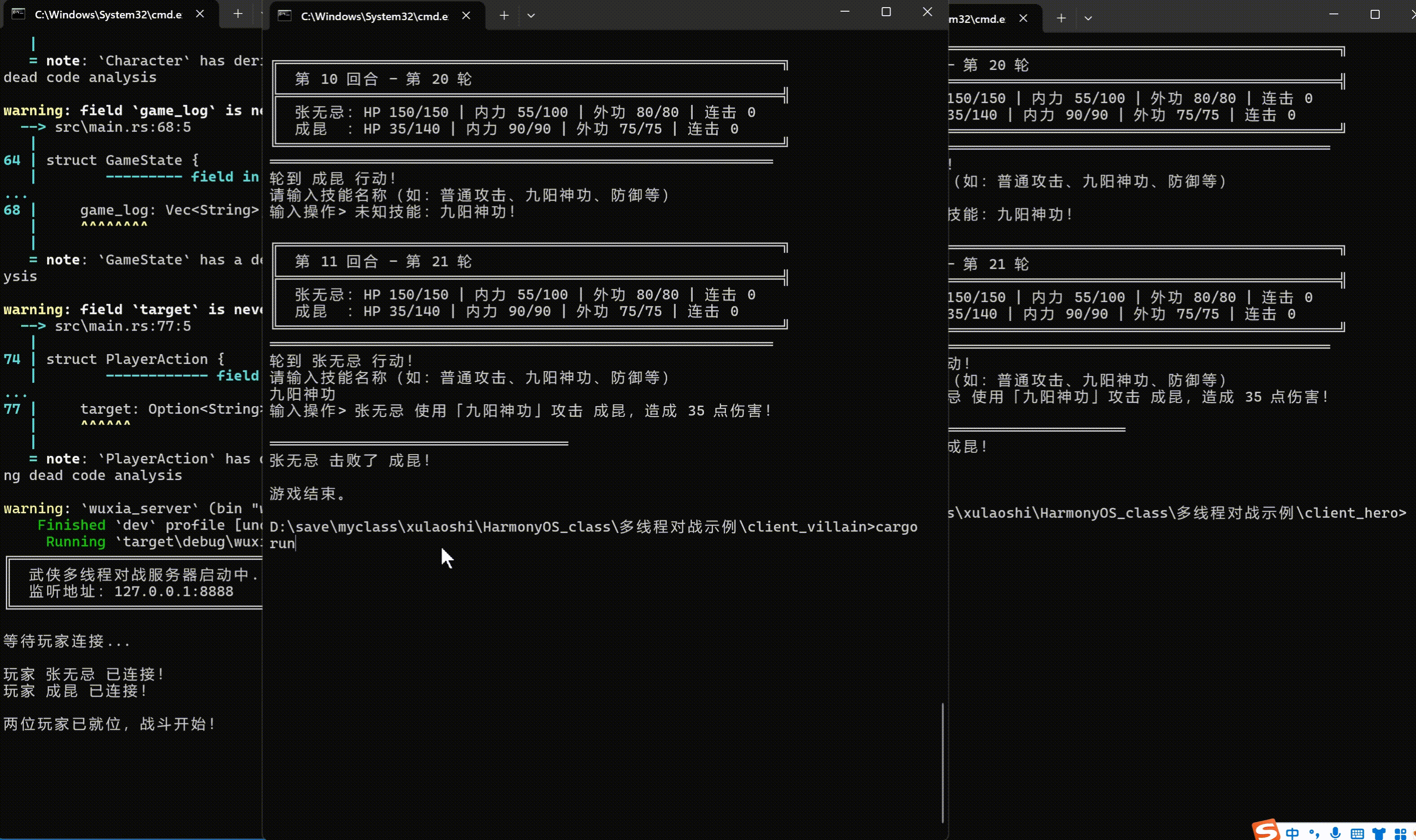 通过这个武侠多线程对战项目,我深刻体会到了 Rust 在并发编程领域的独特魅力。编译时保证线程安全让我不再担心数据竞争和死锁问题,Arc<RwLock<>> 和 Arc<Mutex<>> 的设计让多线程编程变得既安全又高效。独立线程架构的设计让我理解了职责分离的重要性,而 Channel 通信机制则展示了类型安全的线程间通信之美。最重要的是,Rust 的零成本抽象让我在获得安全性的同时,性能没有丝毫损失。这个项目不仅让我掌握了多线程编程的核心技术,更让我认识到:好的语言设计可以让并发编程从"容易出错"变成"难以出错"。🛡️⚔️