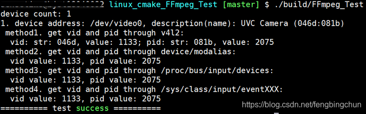 2. 通过解析/sys/class/video4linux/xxxx/device/modalias文件,其中xxxx为video0或video1等,当有usb camera插入到Linux上时,则会有此文件,其内容例如为” usb:v046Dp081Bd0012dcEFdsc02dp01ic0Eisc01ip00in00”,其中”usb:v”后四个字符为vid,”usb:v046Dp”后四个字符为pid,代码段如下:其中str为设备地址,如"/dev/video0"