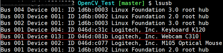 7. 可以通过执行lsusb命令获取vid和pid,执行结果如下:其中红框标注的为真实usb摄像头信息