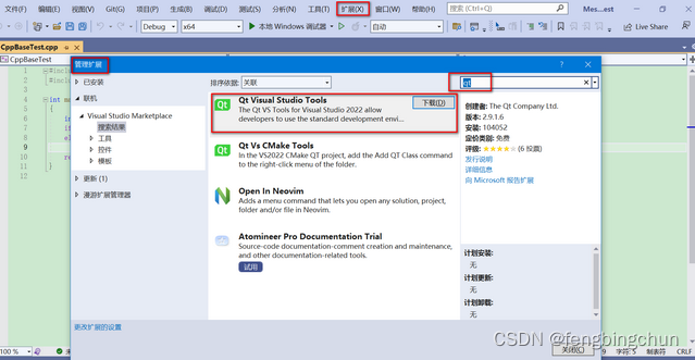 (2).扩展 --> 管理扩展:搜索qt,选择Qt Visual Studio Tools,如下图所示,点击下载,安装完后重启vs2022