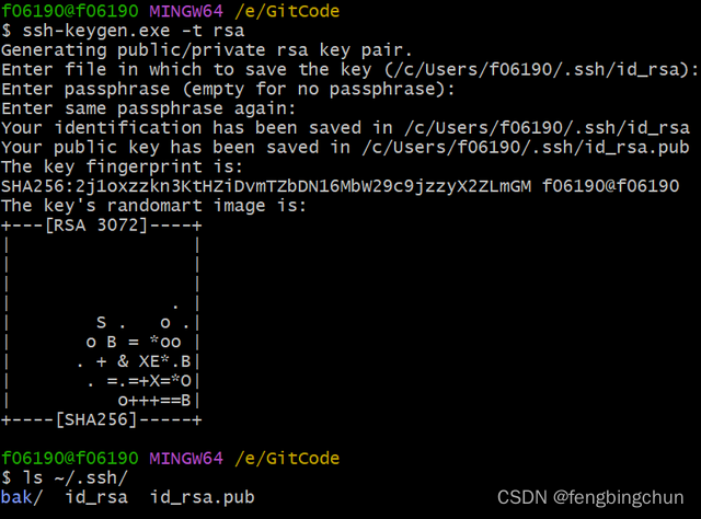 1.通过ssh-keygen产生公私钥:执行:ssh-keygen -t rsa ,如下图所示:连续3次回车,默认生成的文件存放到~/.ssh目录下,也可指定存放到其它目录;密码为空
