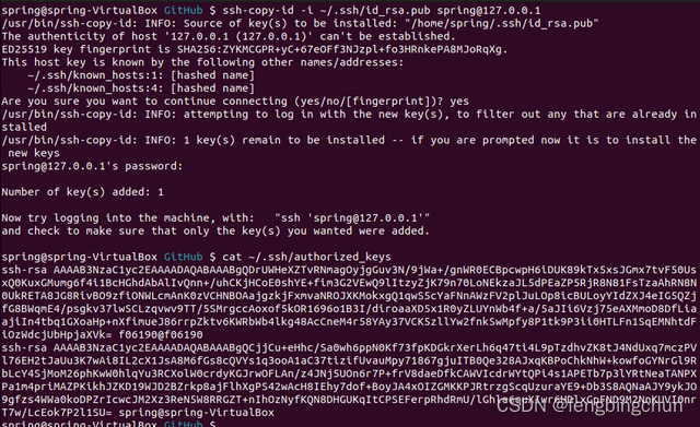 (2).通过sh-copy-id:如下图所示,authorized_keys文件可存放多个公钥,此时~/.ssh/authorized_keys 文件中存放着两个公钥