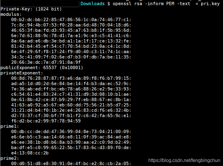 结果如下图:注意:模数需要去除Modulus下的第一个字节即00,公钥和私钥提取的模数和指数都是相同的,只是私钥会有额外的信息输出。