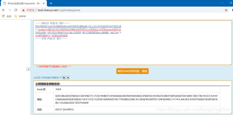 2. 通过网页http://web.chacuo.net/netrsakeypair 中的Rsa公私钥解析按钮,结果如下图,与Linux结果一致:
