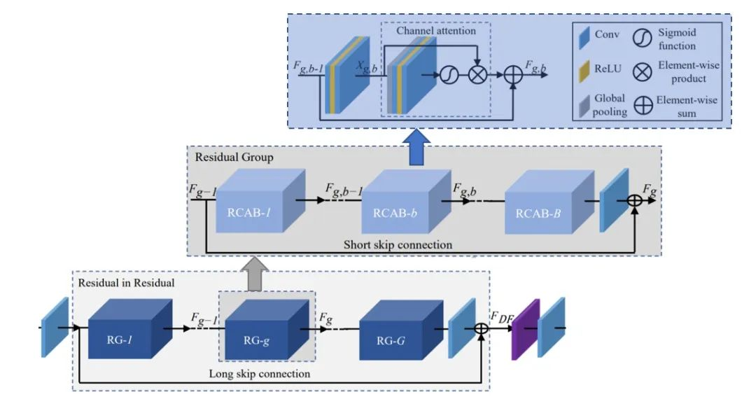 1.采用RCAN中的deep residual channel attention模块重构细节;