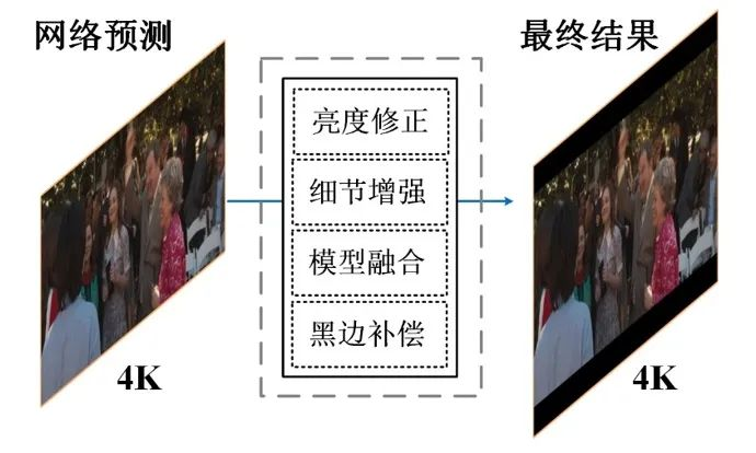 双模型融合,平衡不同模型设计下去噪与超分细节之间的矛盾,同时使预测结果的亮度估计更加稳定。