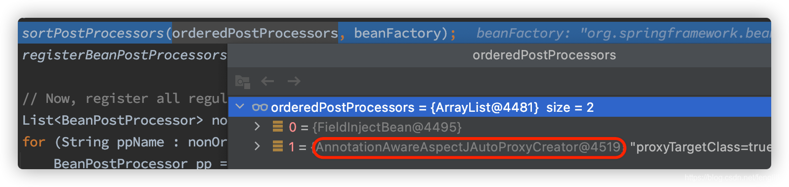//区分内部与优先级更高的processors priorityOrderedPostProcessors 然后是ordered排序,这个是这个问题的关键
