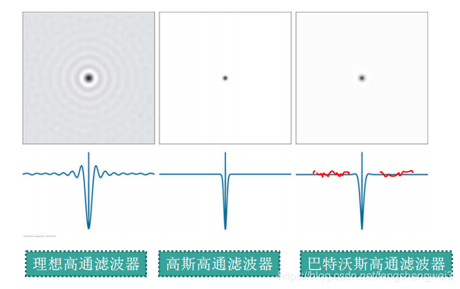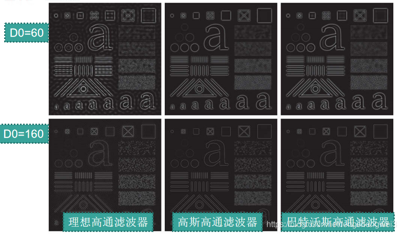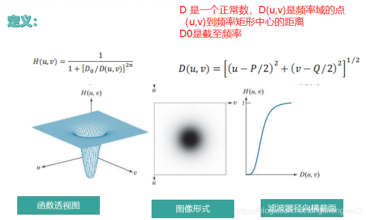 说明:理想表明在半径为D0的圆内,所有频率完全衰减,而在圆外则完全被通过,它是关于原点径向对称的,也就是说定义一个径向截面,然后旋转360°就可以得到一个理想低通滤波器