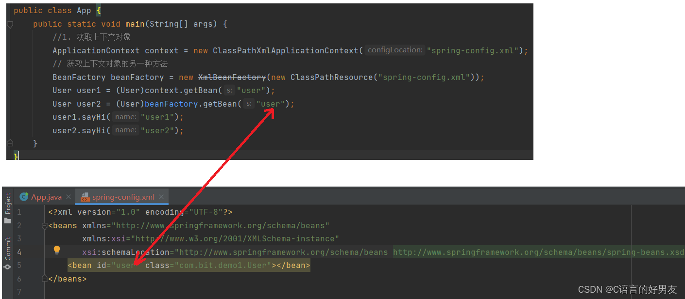 <bean id="user" class="com.bit.demo1.User"></bean>